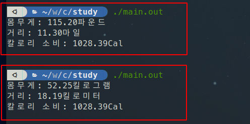 printf("칼로리 소비: %4.2fCal\n", coeff * weight * distance);