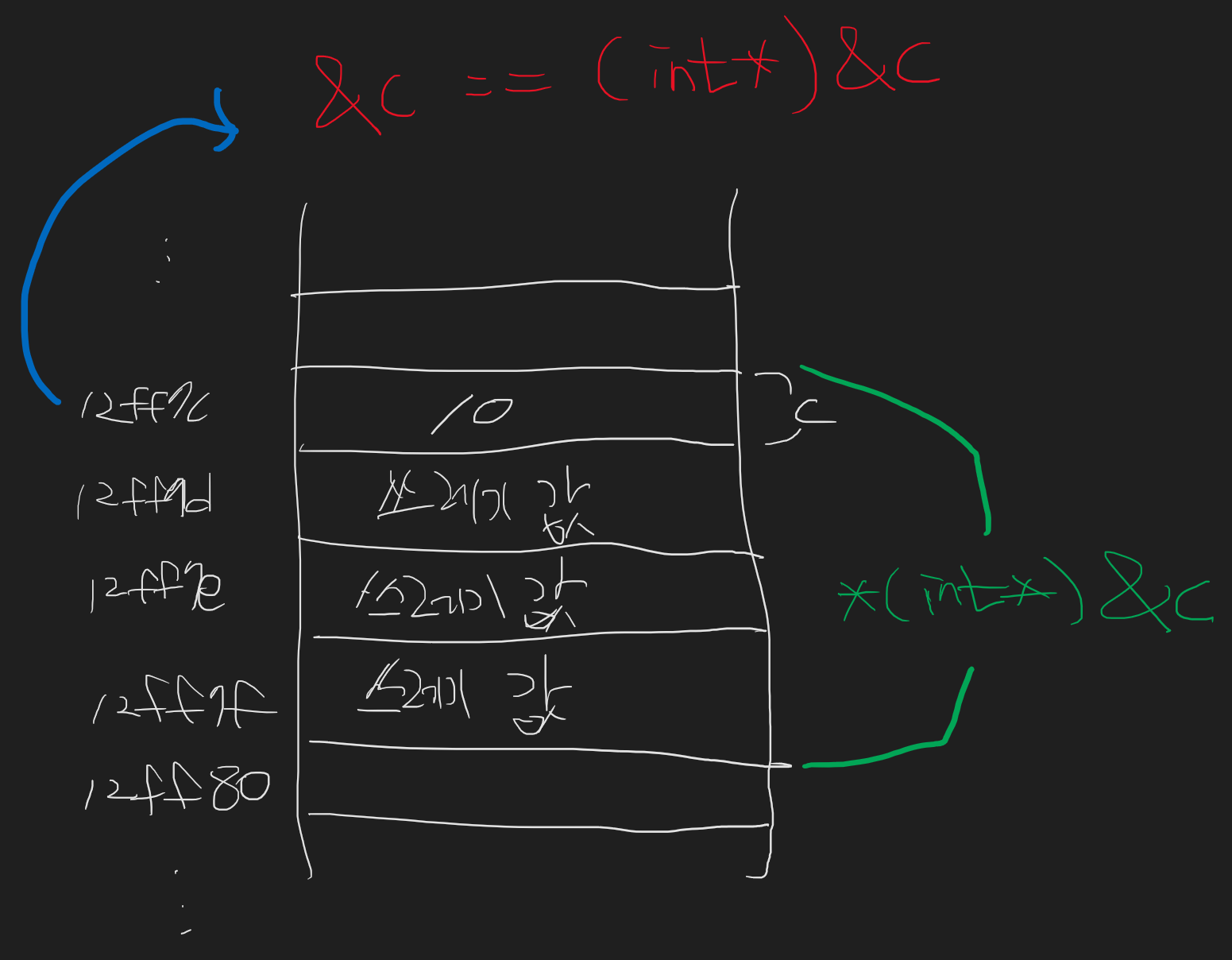 12ff7c 주소에 10이 저장되고 나머지 12ff7d, 12ff7e, 12ff7f 주소는 데이터를 저장한 것이 아니기 때문에 값을 알 수 없고 12ff7c부터 12ff7f까지의 내용에 접근하는 (*(int*)&c)는 쓰레기 값이 된다.
