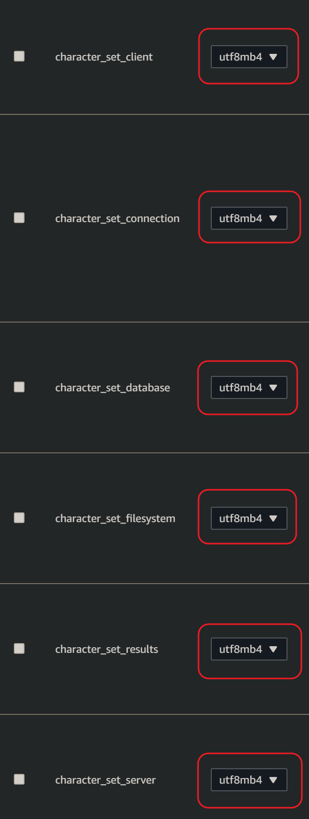 character 항목들은 모두 utf8mb4로 변경.