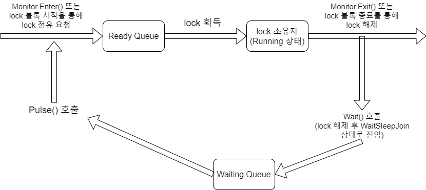 작업을 수행하던 스레드가 일을 마친 뒤 Pulse() 메소드를 호출하면 CLR은 Waiting Queue의 가장 첫 요소 스레드를 꺼낸 뒤 Ready Queue에 입력시킨다.