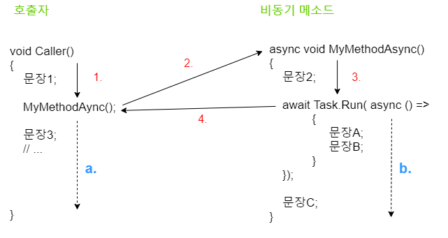 위 그림에서 Caller()의 실행이 시작되면, 1의 흐름을 따라 문장1이 실행되고, 이어서 2를 따라 MyMethodAsync() 메소드의 실행으로 제어가 이동한다. MyMethodAsync() 에서는 3을 따라 문장2가 실행되고 나면 async 람다문을 피연산자로 하는 await 연산자를 만나게 된다. 바로 여기에서 CLR은 4를 따라 제어를 호출자인 Caller() 에게로 이동시키고, 위 그림에서 점선으로 표시되어 있는 a와 b의 흐름을 동시에 실행하게 된다.