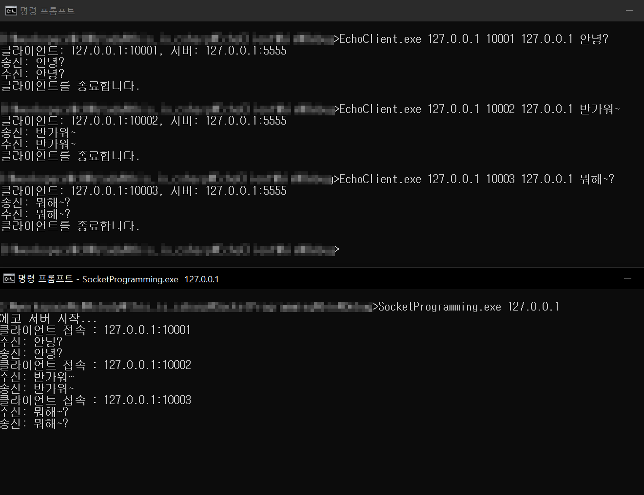 다음은 Echo 서버 & 클라이언트 예제 코드다. 클라이언트가 보내오는 메시지를 서버가 그대로 '메아리'쳐 돌려보내는 간단한 프로그램이다.