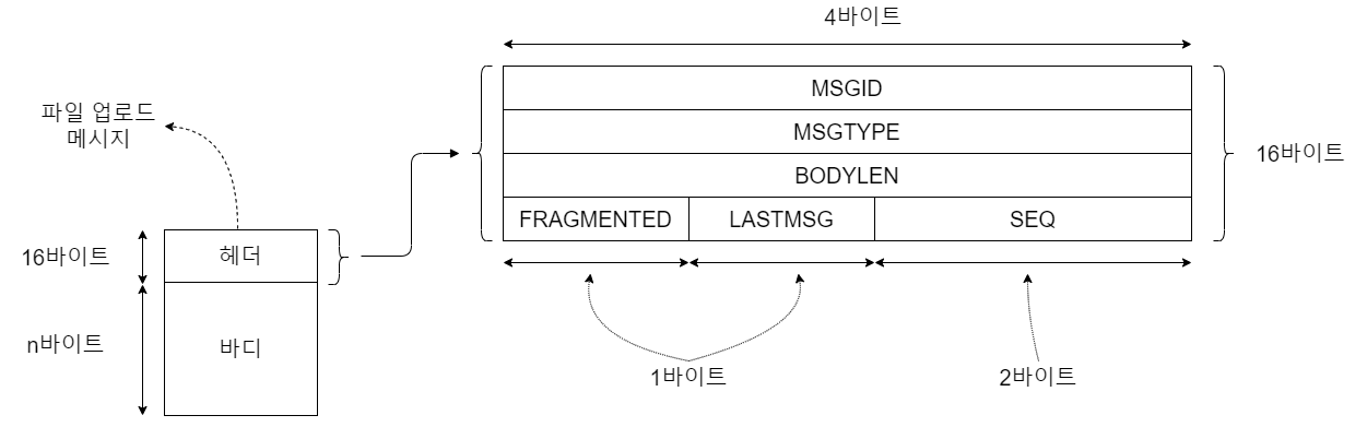 설계할 파일 업로드 프로토콜의 이름은 FUP(File Upload Protocol)이라고 해보자. 이 프로토콜은 헤더와 바디의 두 부분으로 나뉜다. 바디에는 실제로 전달하고자 하는 데이터를 담고, 헤더에는 본문 길이를 비롯하여 메시지의 속성 몇 가지를 담을 것이다. 바디의 길이는 담는 데이터에 따라 달라지지만 헤더의 길이는 16바이트로 항상 일정하다. 따라서 수신한 패킷을 분석할 때는 가장 먼저 16바이트를 먼저 확인하여 바디의 길이를 포함한 메시지의 속성을 확인하고, 그 다음 바디의 길이만큼을 또 읽어 하나의 메시지 끝을 끊어내야 한다.