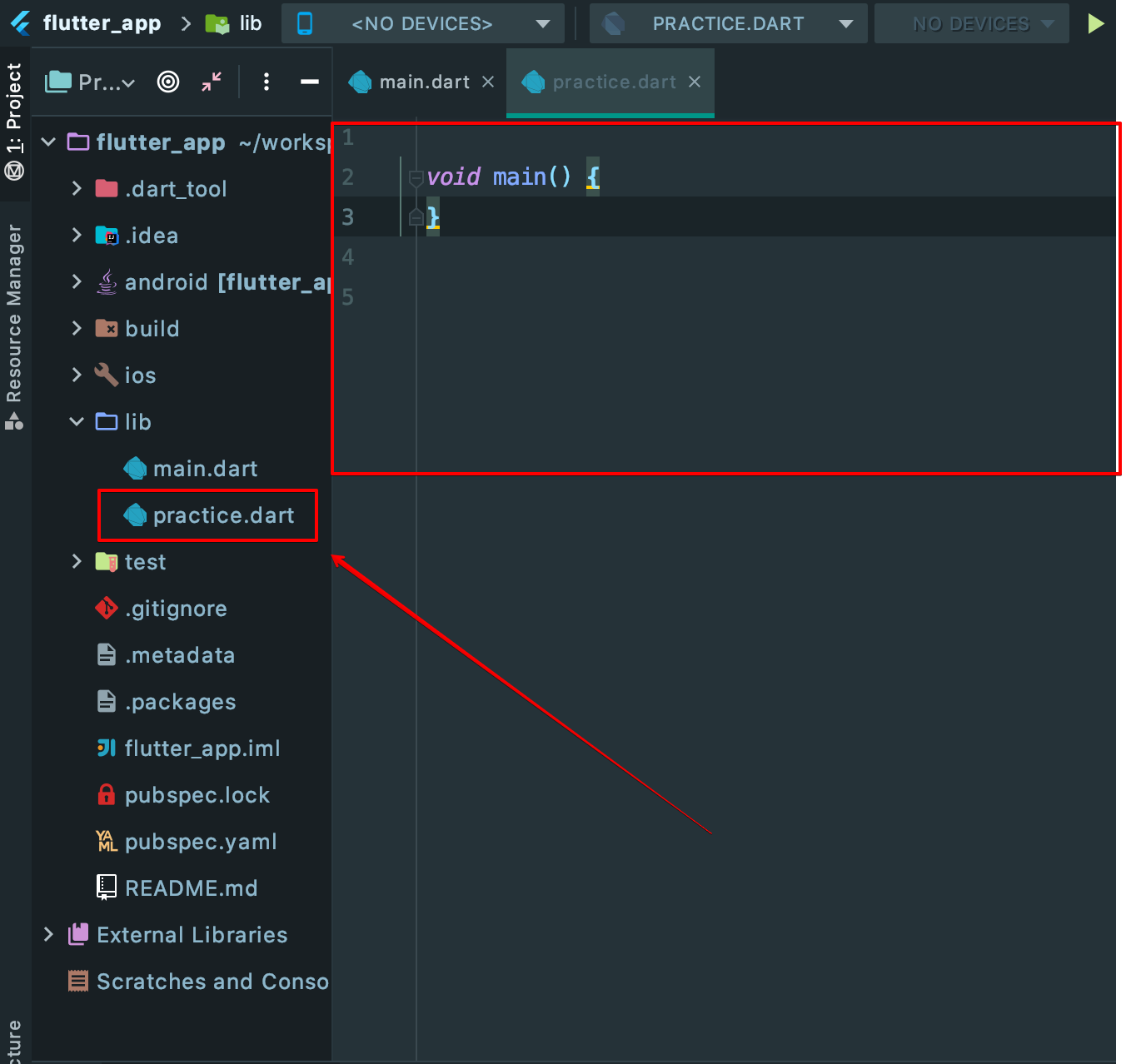 android studio나 intellij 에디터를 사용한다면 dart 파일이 새로이 생성하여 이곳에서 테스트 및 연습을 하면 된다.