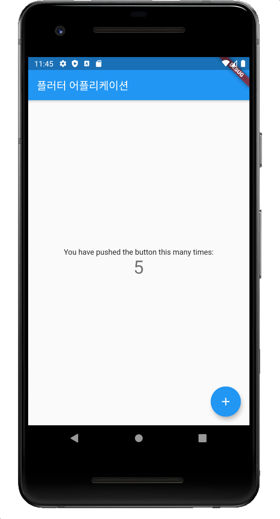 - AppBar 클래스는 title 프로퍼티에 Text위젯을 정의했다. Text 위젯은 글자를 나타내는 위젯이며 인수로 widget.title 값을 넘겨받아 화면에 표시한다. widget은 StatefulWidget 클래스(MyHomePage)의 프로퍼티를 참조할 때 사용한다.