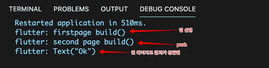 화면이 표시되면서 build() 메소드가 호출된다. pop() 메소드로 뒤로 돌아갈 때는 두 번째 화면에서 받은 Text 객체가 출력되었다.