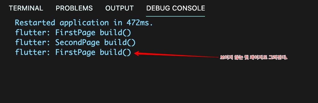 build() 메소드가 언제 호출되는지 확인해보자. 각 화면의 build 메소드의 return 앞에 어떤 화면인지 확인할 수 있도록 print() 로그를 작성하자.