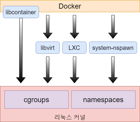 Docker가 처음 개발될 당시에는 LXC를 기반으로 구현을 하였지만 버전 0.9부터는 LXC를 대신하는 libcontainer를 개발하여 사용하고 있다. 내부적으로는 실행 드라이버(exec driver)라고 하는데 libcontainer는 native, LXC는 lxc로 표시된다. 실행 옵션에 따라 libcontainer를 사용하지 않고 lxc를 사용할 수도 있다.