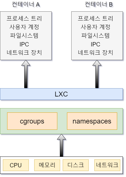 LXC는 리눅스 커널의 cgroups와 namespaces 기능을 활용하여 가상 공간을 제공한다.