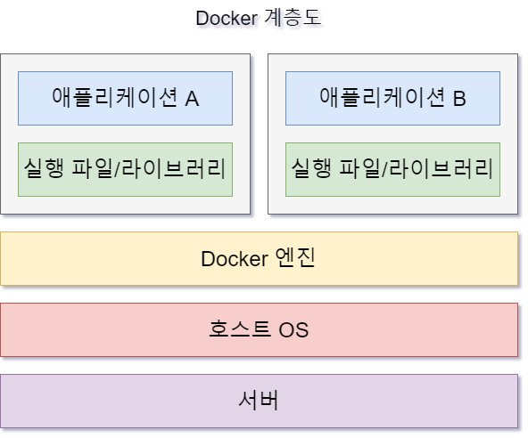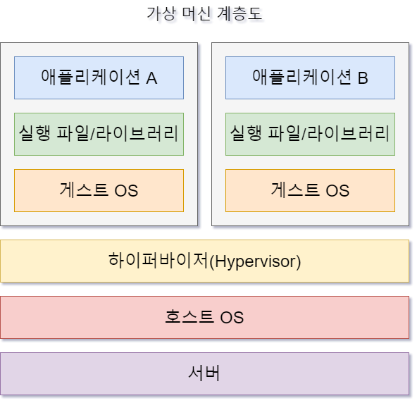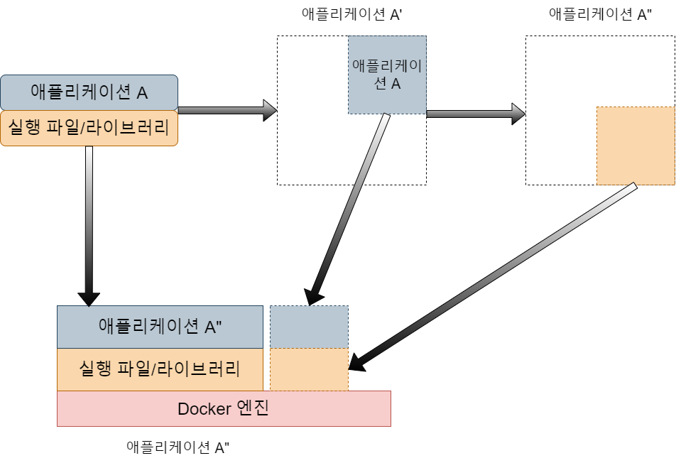 위의 그림과 같이 가상 머신 자체는 완전한 컴퓨터라 항상 게스트 OS를 설치해야 한다. 그래서 이미지 안에 OS가 포함되기 때문에 이미지 용량이 커진다.