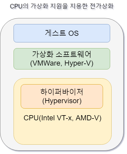 전가상화(Full Virtualization)의 느린 속도를 개선하기 위해 반가상화(Paravirtualization) 방식이 개발되었고, 현재 널리 쓰이고 있다.