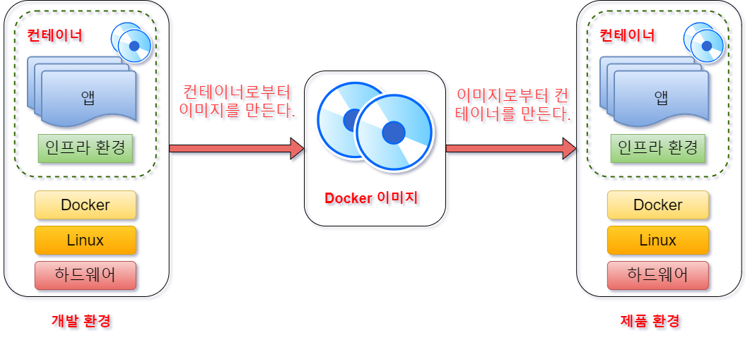 Docker에서는 이러한 인프라 환경을 컨테이너로 관리한다. 애플리케이션의 실행에 필요한 모든 파일 및 디렉토리들을 컨테이너로서 모아버리는 것이다. 이러한 컨테이너의 바탕이 되는 Docker 이미지를 Docker Hub와 같은 Repository에서 공유한다.