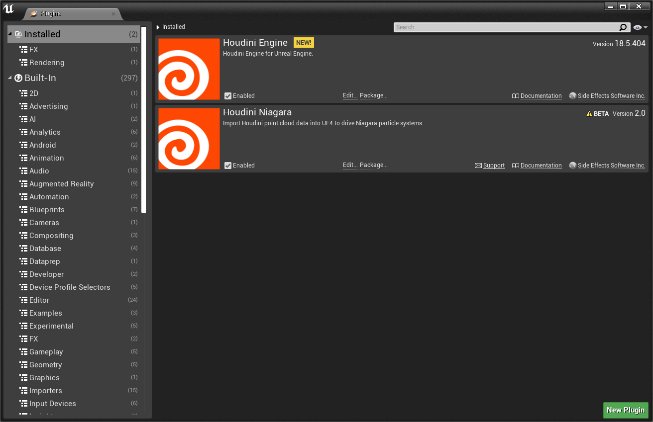 Houdini Engine 빌드가 완료된 후 Unreal Engine을 실행하여 Plugins 창을 열어 Houdini Engine을 활성하면 하면 된다. 그러면 이제 Unreal Engine에서 Houdini Engine을 사용할 수 있다.
