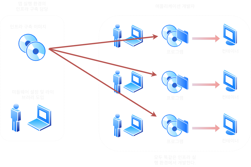 애플리케이션 개발자는 애플리케이션의 구축 부분을 코딩하고 이미 작성이 끝난 베이스 이미지를 바탕으로 한 이미지를 작성한다. 이 이미지 안에는 프로그래밍이 끝난 업무 애플리케이션이 전개된다.