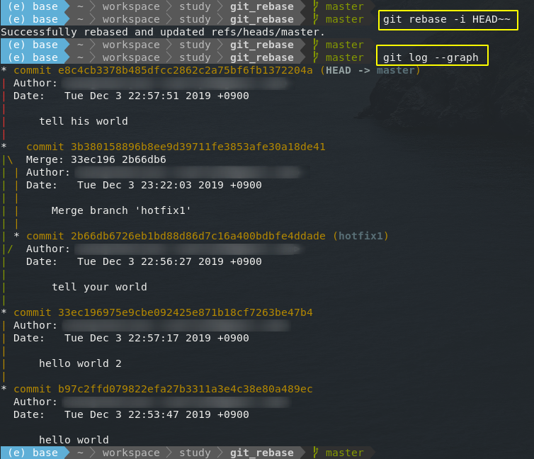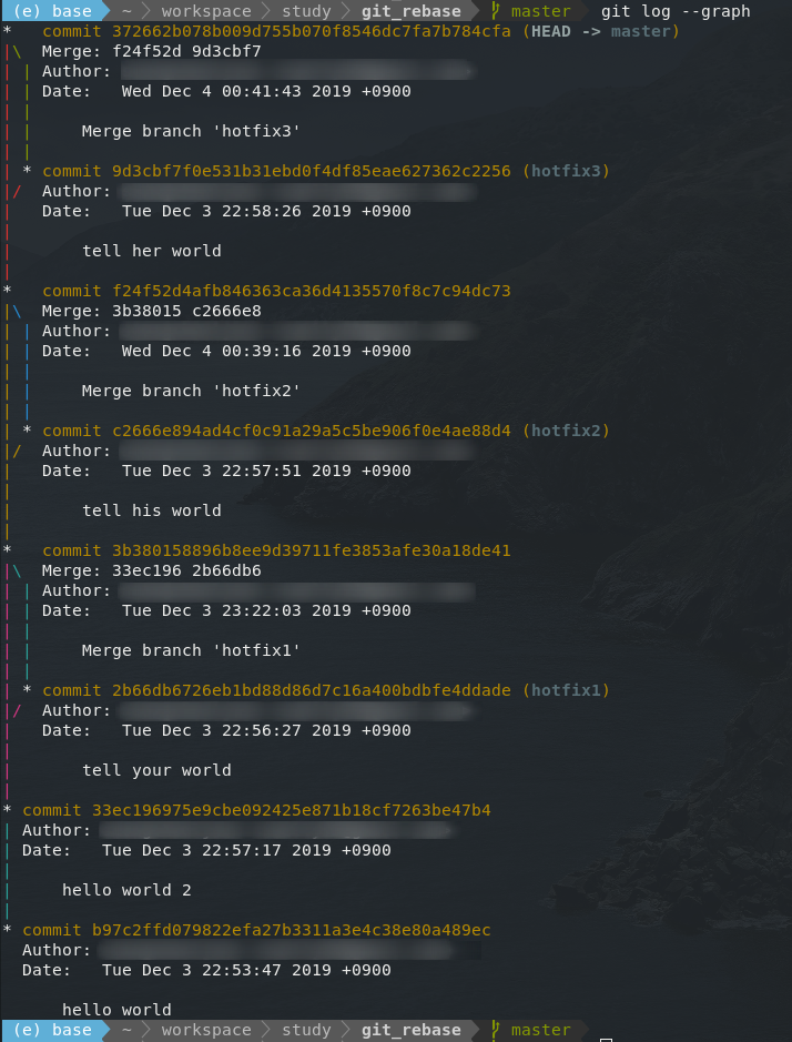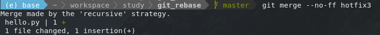 여기까지만이라면 단순하게 hotfix1과 master 브랜치가 따로따로 있는 것에 불과하게 된다. 말 그대로 hotfix1의 base를 다시(re) 설정한 것과 같은 효과이다.