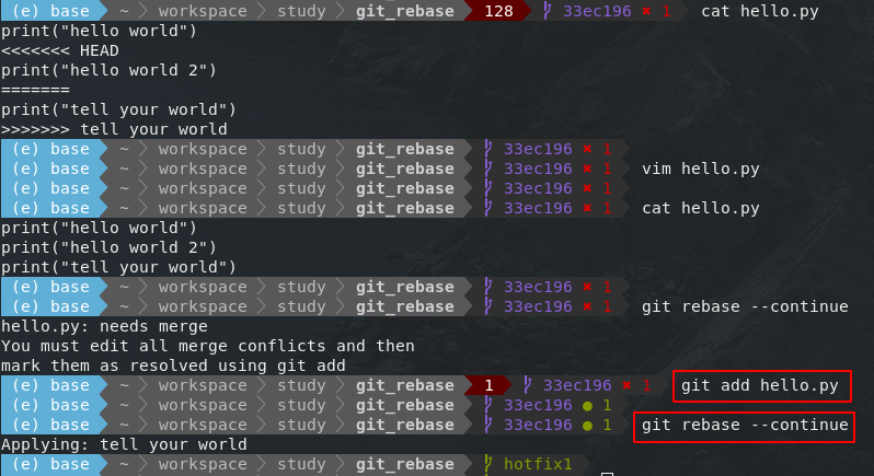 | git rebase --continue | 충돌 상태를 해결한 후 계속 작업을 진행할 수 있게 한다. |