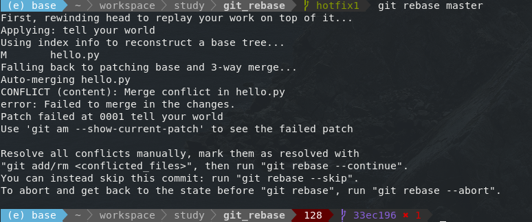 master 가 아닌 hotfix1 브랜치에서 rebase 명령을 실행하는 이유는 '(hotfix) rebase (onto) master' 라는 것이다.