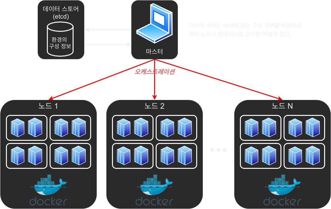 kubernetes가 오케스트레이션 툴이라 불리는 이유도 이 마스터 서버가 여러 대로 분산 구성된 노드를 모아서 관리함으로써 이용자가 봤을 때는 마치 한 대의 서버인 것처럼 행동할 수 있기 때문이다.