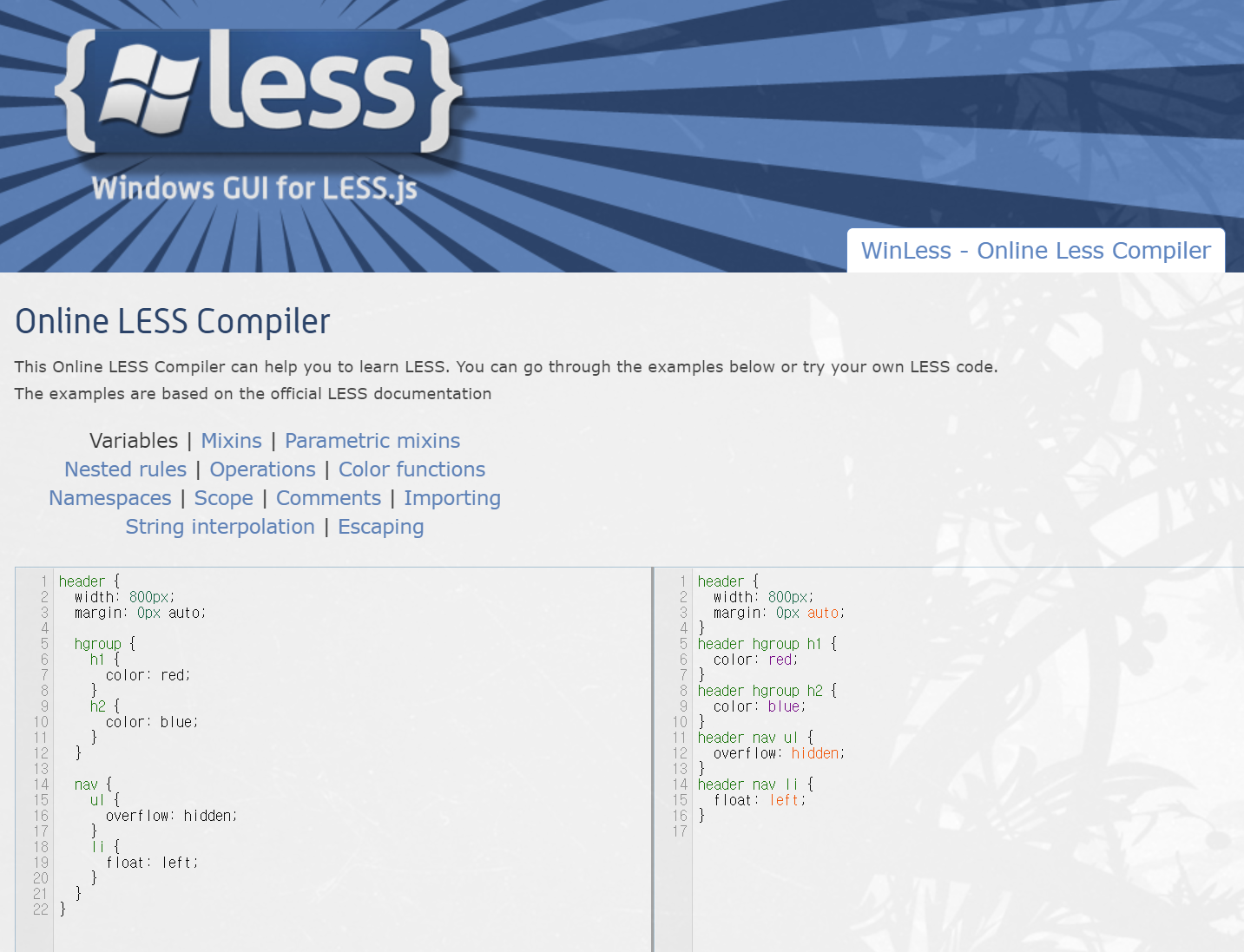 Online LESS Compiler This Online LESS Compiler can help you to learn LESS. You can go through the examples below or try your own LESS code. The examples are based on the official LESS documentation