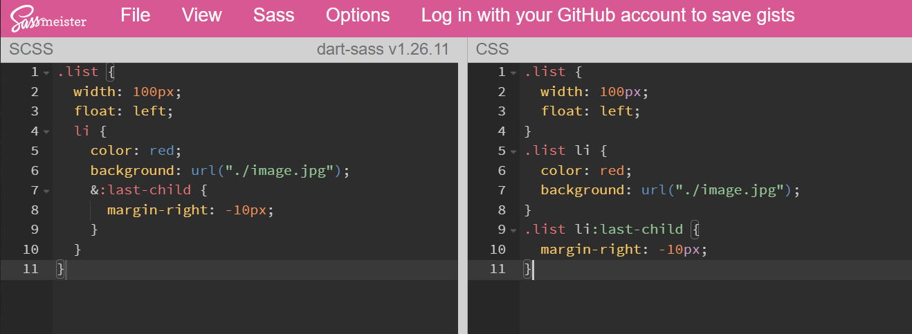 왼쪽에 SCSS 코드를 적으면 곧바로 오른쪽에 CSS로 변환된 코드가 나타난다. 이렇게 간단하게 사용할것이면 이것을 이용해도 될 것이다.
