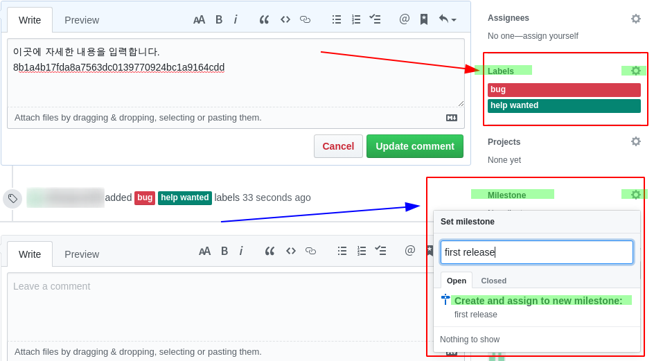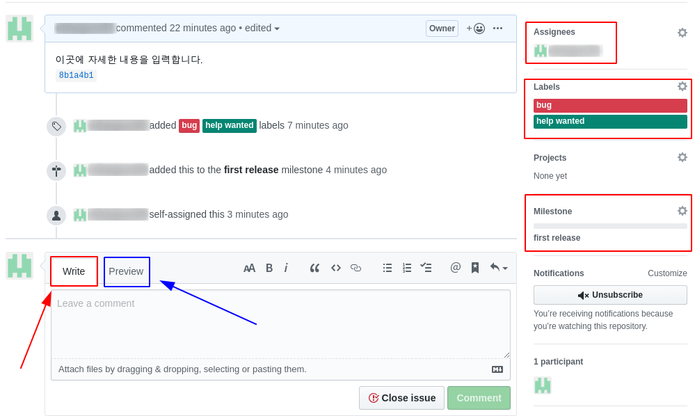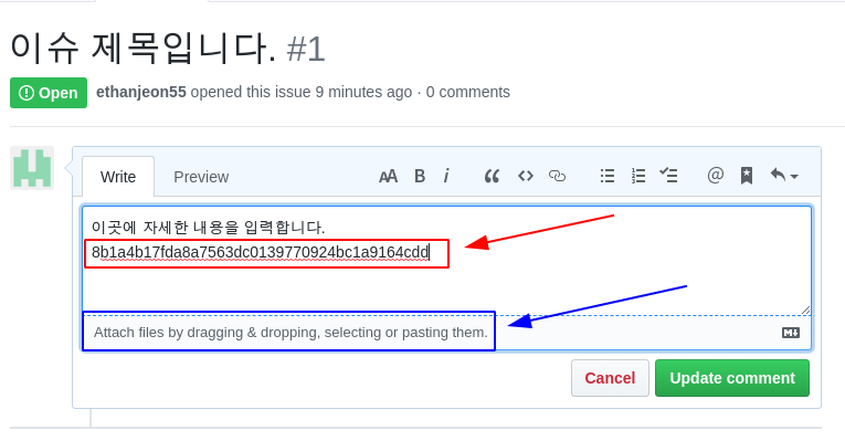 - Write: 댓글을 입력하는 곳이다. 이슈 작성과 마찬가지로 커밋 SHA-1 체크섬 값이나 그림을 넣을 수 있다.