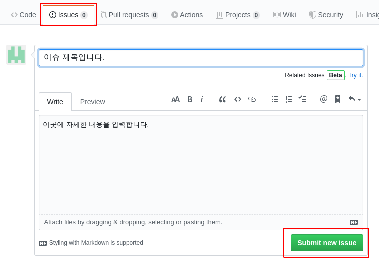 <New issue> 를 클릭한 후 이슈를 작성한다.