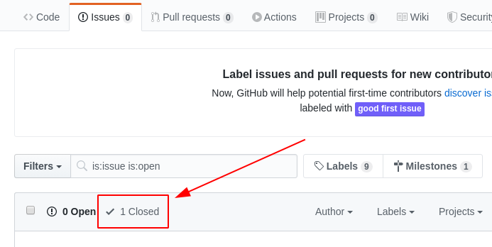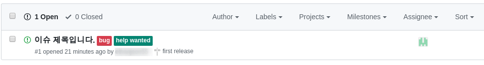 이슈를 작성할 때 라벨과 마일스톤을 지정하면 아래 그림과 같다. 이슈 넘버는 자동으로 1부터 증가한다.