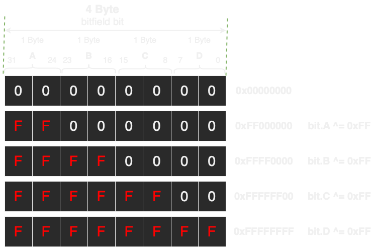 main() 함수는 'a', 'b', 'c', 'd' 문자이면 프로그램을 실행하고 아니면 종료한다. bitfield bit의 각 1바이트씩을 문자에 따라 ^ 연산자를 사용하여 on/off 한다.