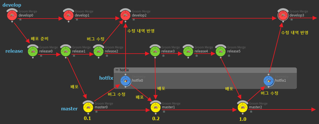 - hotfix 브랜치에서 버그 수정이 끝나면 develop 브랜치와 master 브랜치에 반영
