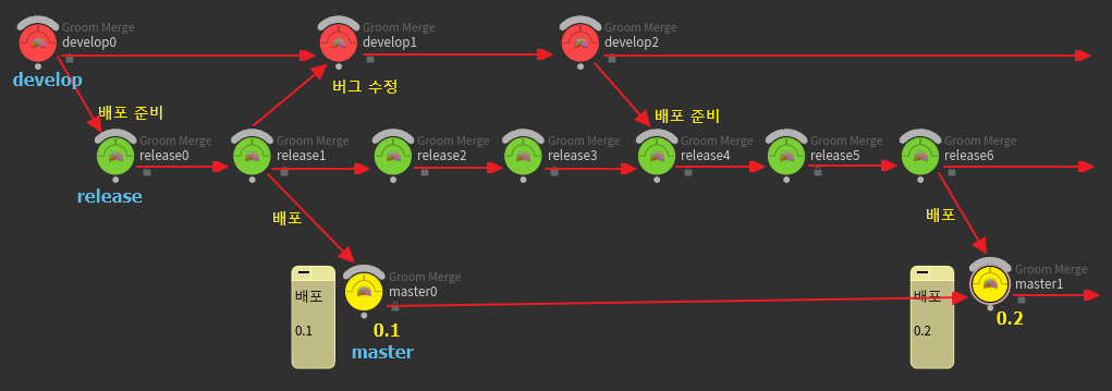 - 배포 시기가 되면 release 브랜치를 기반에 두고 master 브랜치를 생성하여 배포