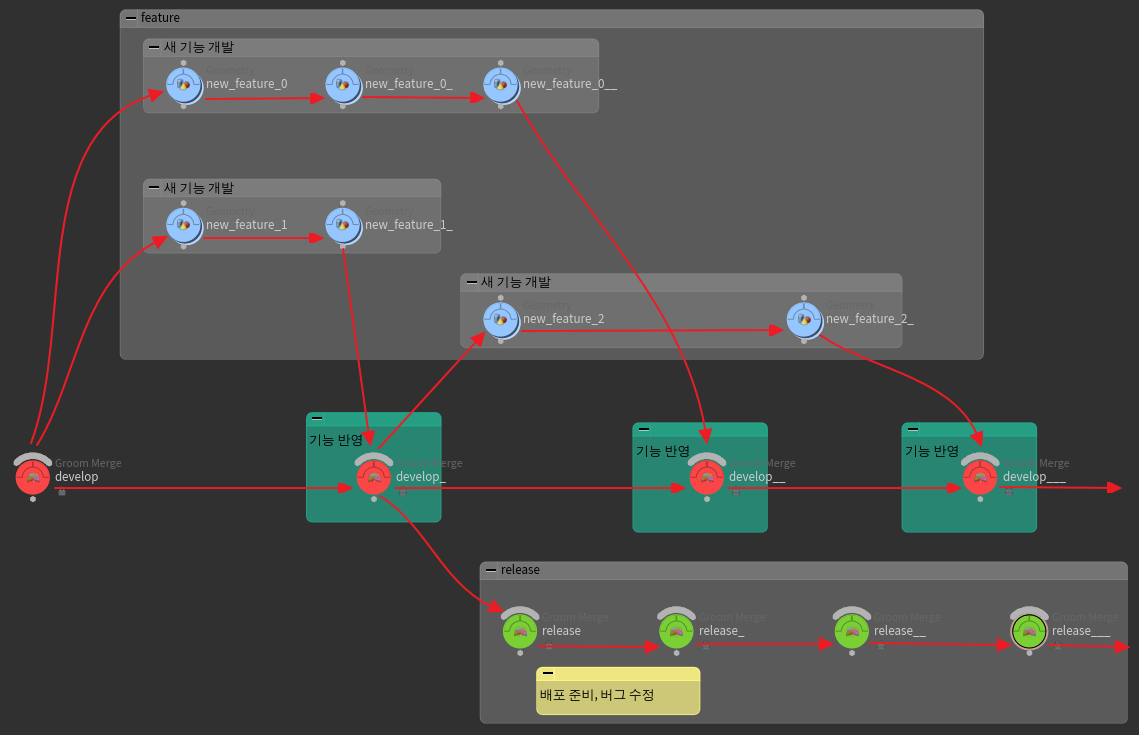 feature 브랜치들은 오직 develop 브랜치에 병합될 때만 관계성이 생긴다. 갈라져 나오는 것도 다시 병합하는 것도 오직 develop 브랜치와만 한다.