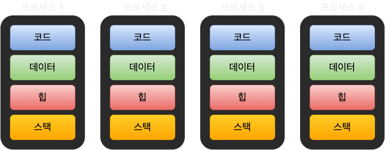 위의 그림을 보면 멀티프로세스에서는 모든 프로세스가 서로 다른 메모리 공간을 가지므로 데이터를 공유라려면 특별한 기법을 사용해야 한다.