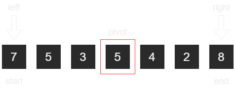 pivot은 정렬되지 않은 리스트에서 가운데 위치한 인덱스의 데이터를 말한다. 주의할 점은 인덱스가 아니라 데이터라는 것이다. start는 첫 번째 인덱스이고 end는 미자막 인덱스이다. left와 right는 각각 start와 end를 가리킨다.