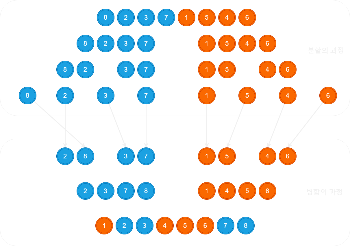 분할이 완료되었다면 이제 병합을 진행할 차례이다. 위 그림에서 보이듯이, 우선 나뉘었던 둘을 하나로 묶는다. 8과 2개 원래 하나였으니, 이 둘을 하나로 묶는다. 단, 그냥 묶는 것이 아니라 정렬순서를 고려해서 묶는다. 이렇듯 분할이 총 3회 진행되었으니, 묶는 과정도 총 3회에 걸쳐 진행된다. 그리고 그 결과 정렬이 완료된다.