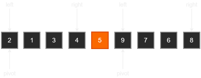 위 그림에서 보이듯이, 제자리를 찾은 5를 기준으로 왼쪽 영역과 오른쪽 영역을 대상으로 위에서 설명한 과정을 반복하게 된다. 그러면 왼쪽 영역의 피벗인 2와 오른쪽 영역의 피벗인 9가 제 자리를 찾을 것이다. 그리고 또 이어서, 제자리를 찾은 2를 기준으로 나뉘는 왼쪽 영역과 오른쪽 영역을 대상으로 제 자리를 찾은 9의 왼쪽과 오른쪽 영역을 대상으로, 퀵 정렬의 기본과정을 반복해 나간다.