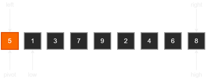 - low : 피벗을 제외한 가장 왼쪽에 위치한 지점을 가리키는 이름