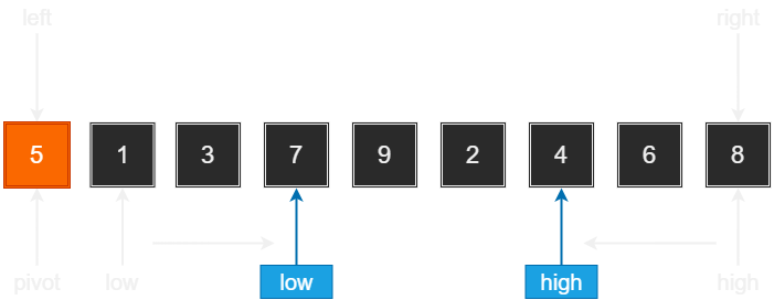 교환 후에도 low는 피벗보다 큰 값을 찾을 때까지 오른쪽으로, high는 피벗보다 작은 값을 찾을 때까지 왼쪽으로 이동해 나간다. 그러면 결국에는 다음과 같이 low와 high가 가리키는 위치가 교차되는 상황이 발생한다.