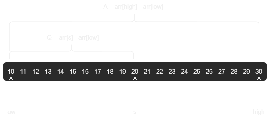 s = (x - arr[low]) / (arr[high] - arr[low]) * (high - low) + low