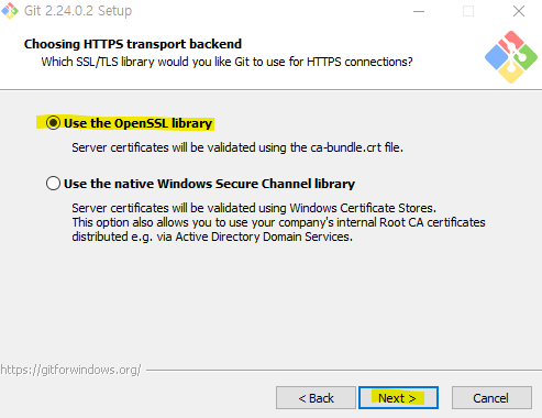 - Use Git from the Windows Command Prompt : 윈도우 커맨드 프롬프트에서 Git을 실행할 수 있는 최소한의 내용을 환경 변수에 추가해 설치한다. 이 옵션을 선택하면 윈도우에 내장된 명령 프롬프트에서 Git을 실행할 수 있다.