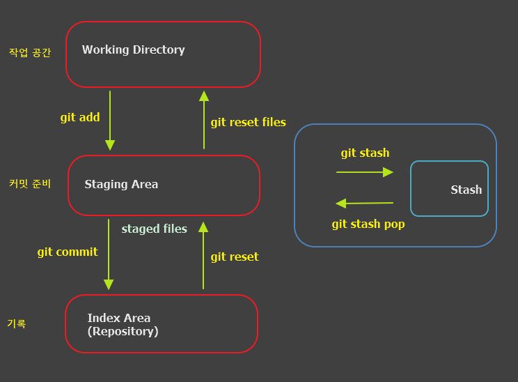 - Staging Area : 커밋할 준비가 된 (staged) 파일들이 위치하는 영역이다.