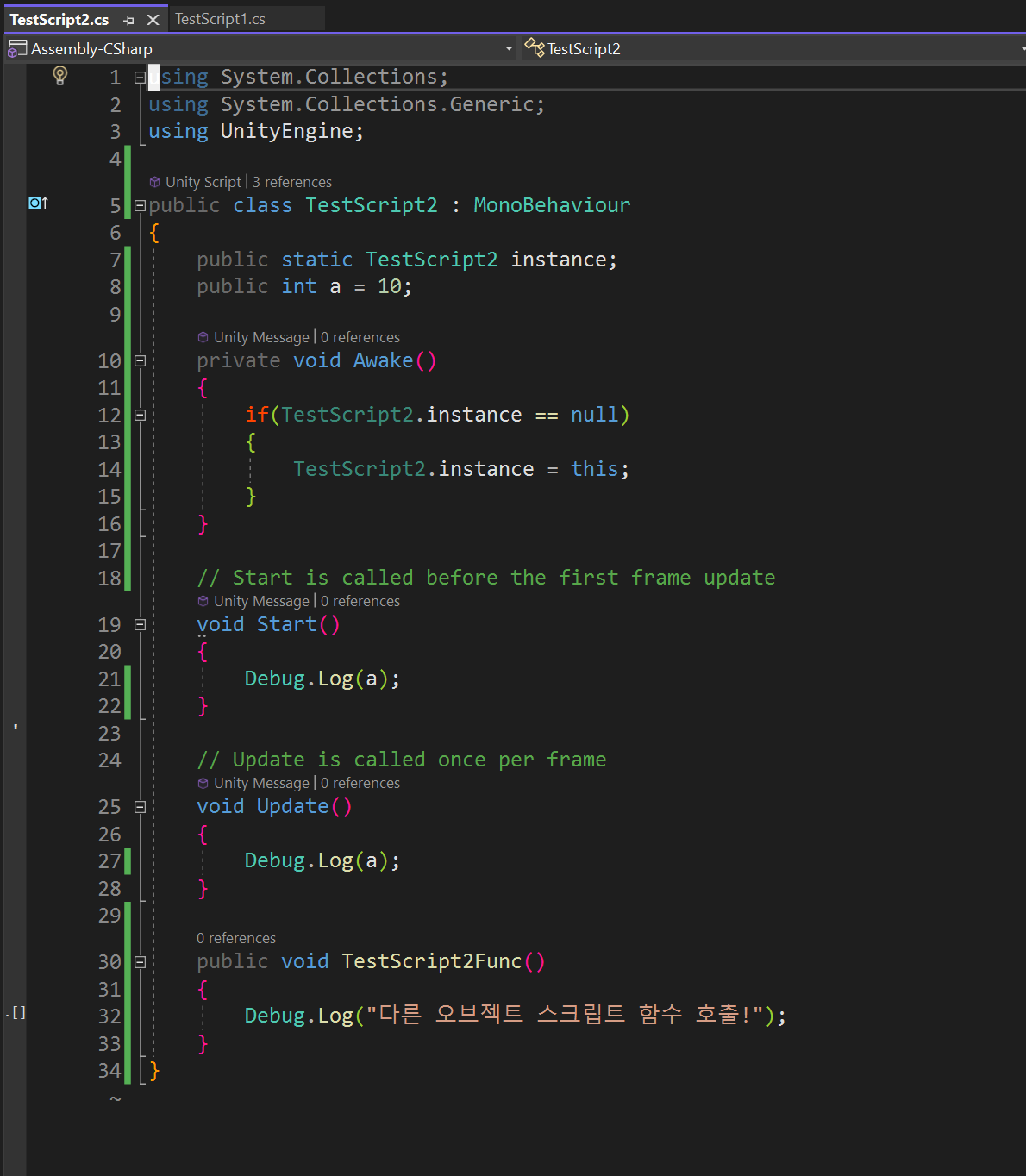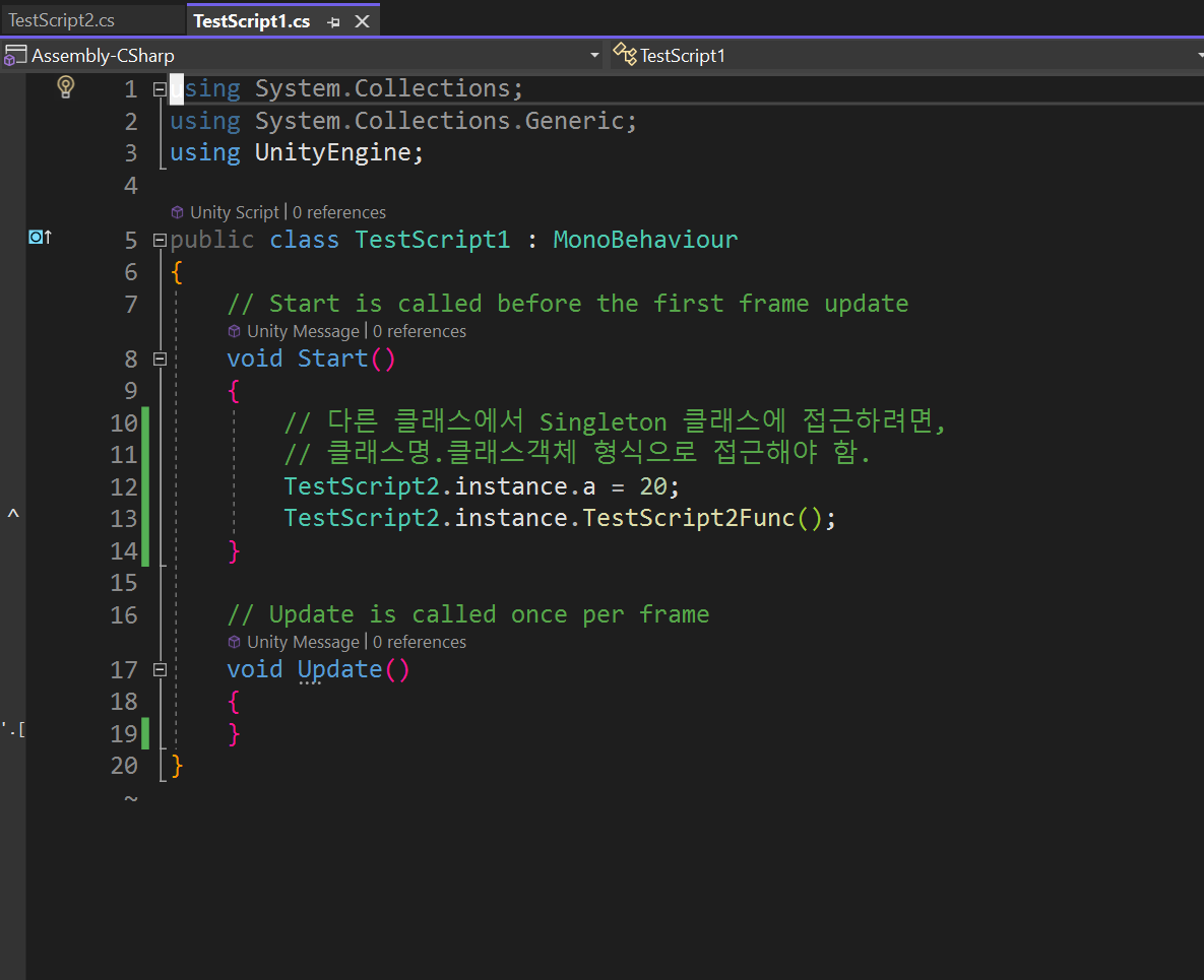이때 사용한 this는 TestScript2 (클래스) 스크립트를 의미한다. 다음과 같이 하면 instance 객체는 한 번만 만들어진다. 여러 클래스에서 접근이 필요한 변수나 함수가 존재할 때 접근을 쉽게 하기 위해 사용하는 방법이 Singleton이다.