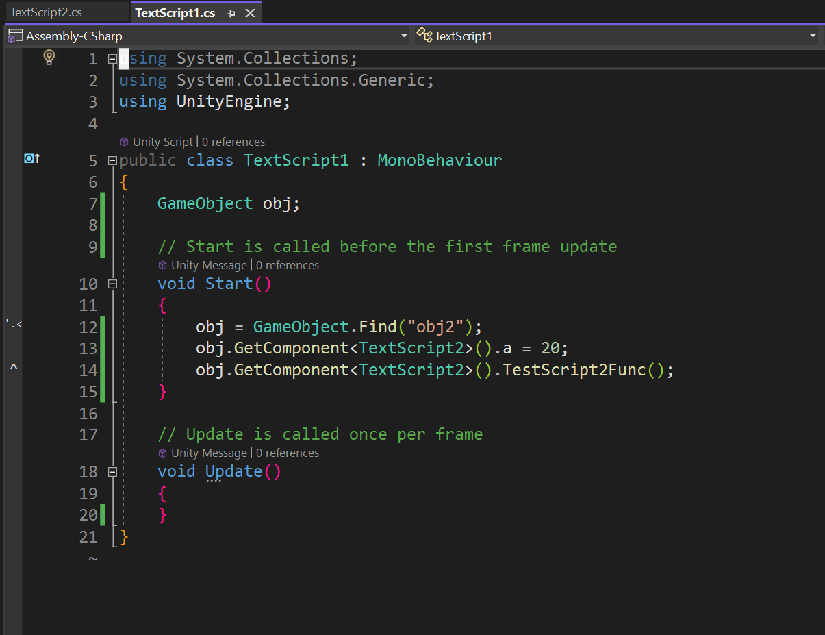 GetComponent 함수를 사용하는 방법과 Singleton 기법을 사용하는 방법이 있다. 2개의 오브젝트 obj1, boj2를 만들고 obj1에는 TextScript1.cs 스크립트를 컴포넌트로 추가하고 obj2에는 TextScript2.cs 스크립트를 컴포넌트로 추가할 것이다. 그리고 TextScript1.cs 스크립트 안에서 obj2의 컴포넌트인 TextScript2.cs 스크립트의 변수를 변경하고 함수를 호출하겠다.