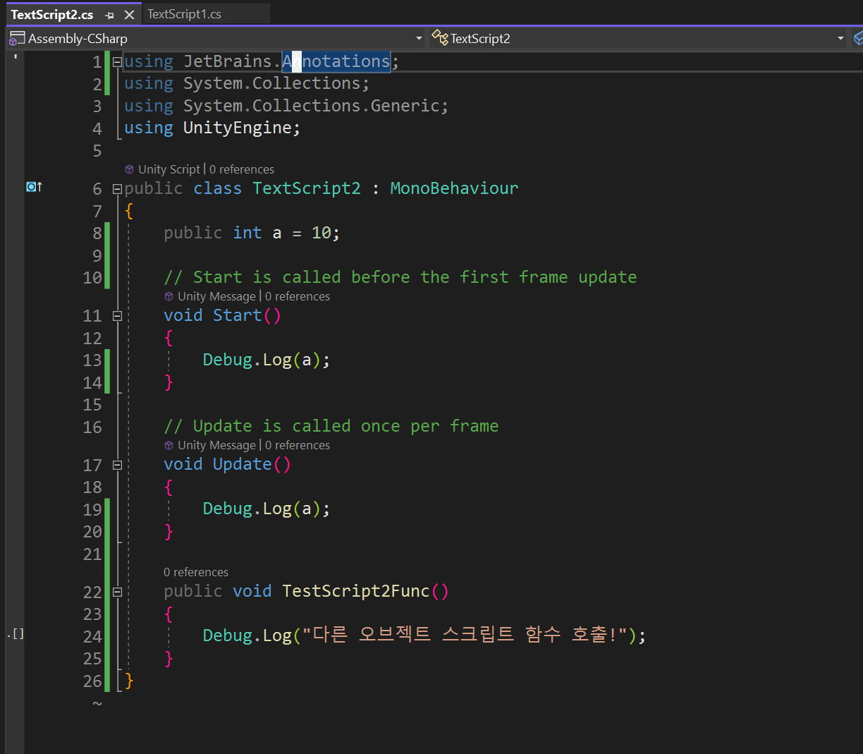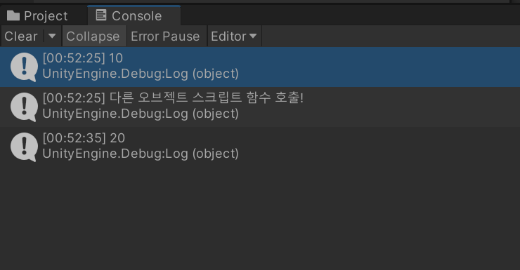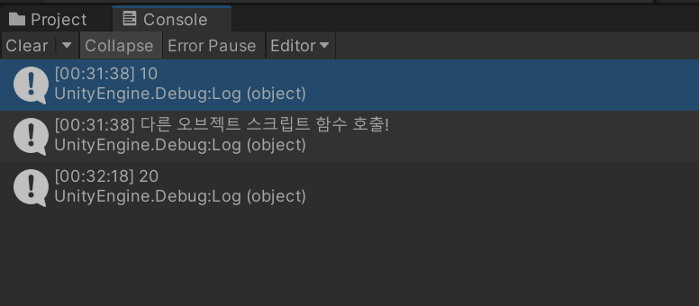 - 변수 값 변경하기: obj.GetComponent<TestScript2>().a = 20;