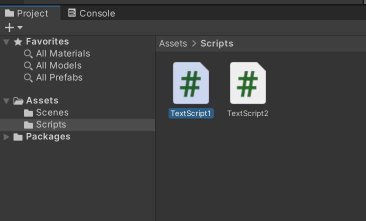 TextScript1 스크립트를 드래그하여 Hierarchy 뷰에 있는 obj1 오브젝트에 놓는다. 마찬가지로 TextScript2 스크립트를 드래그하여 Hierarchy 뷰에 있는 obj2 오브젝트에 놓는다. 이 작업을 통해 obj1 오브젝트에 TextScript1 스크립트를 컴포넌트로 추가하게 된다. obj2 오브젝트에는 TextScript2 스크립트가 컴포넌트로 추가된다.