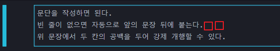 일반적인 문단 작성은 그냥 텍스트를 입력하면 된다. 문단을 구별하러면 한 개 이상의 빈 줄을 문단 사이에 삽입하거나 줄의 마지막에 [Space Bar]를 두 번 이상 눌러 띄어쓰기하면 된다.