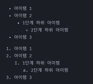 이때 사용하는 숫자는 한 자리 숫자면 어떤 숫자든 상관없다. 하나의 목록 아래에 위치하는 목록을 만들 때는 최소 공백 두 칸을 둔다. 하위 항목을 둘 때마다 일정한 칸 수로 지정해주어야 한다.