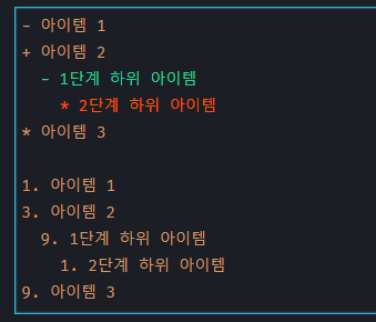 이때 사용하는 숫자는 한 자리 숫자면 어떤 숫자든 상관없다. 하나의 목록 아래에 위치하는 목록을 만들 때는 최소 공백 두 칸을 둔다. 하위 항목을 둘 때마다 일정한 칸 수로 지정해주어야 한다.