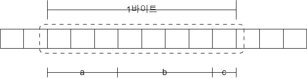 비트 필드를 사용하는 멤버는 정수 타입만 가능한데, 멤버의 뒤에 적힌 숫자가 멤버가 차지할 비트 수를 의미하게 된다. 즉 위의 구조체를 사용해서 변수를 정의하게 되면 다음과 같은 메모리 구조를 갖게 된다.