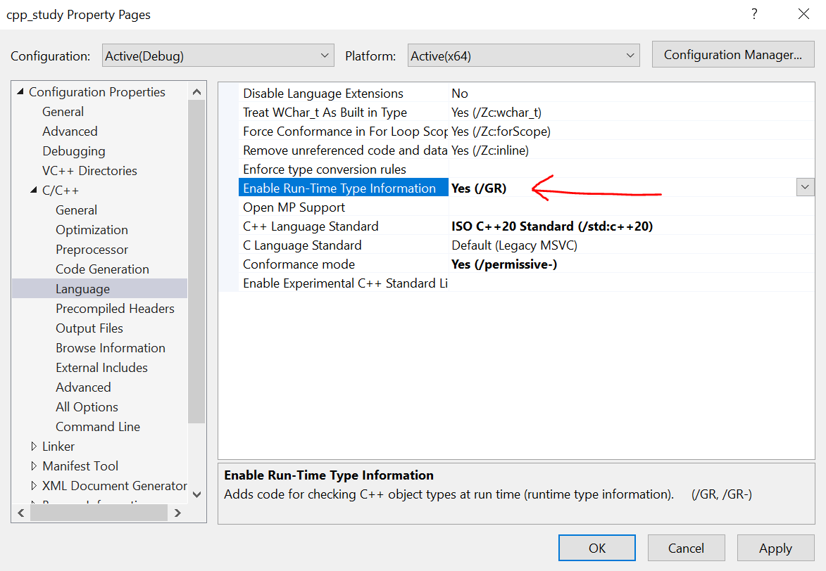 "솔루션 탐색기 > 프로젝트 > 속성" 메뉴를 선택하면 아래 그림처럼 나오는데 "C/C++ > Language" 선택 후 "Enable Run-Time Type Information" 속성을 Yes(/GR) 로 변경한다.