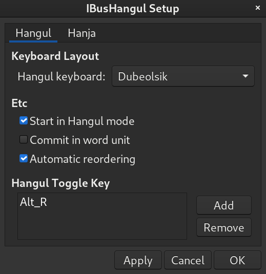 방금 추가한 한글의 preference를 클릭하면 다음의 그림처럼 나온다 .그 후 Hangul Toggle Key를 깨끗하게 비우자.